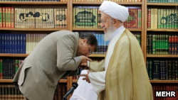 بوسه علی جنتی بر دست مکارم شیرازی. او چندین بار با مراجع تقلید دیدار کرد علی جنتی، وزیر مستعفی ارشاد در جلسه خداحافظی خود از این وزارتخانه گفت برخی به دنبال ایجاد فضایی در ایران هستند که «کسی نتواند تنفس کند».