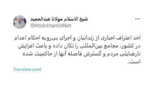 واکنش مولانا عبدالحمید به اعدام فرهاد سلیمی و محمد قبادلو: باعث افزایش نارضایتی مردم شده است!