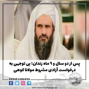 مولانا فضل الرحمن کوهی که درتاریخ ۷ آذر ماه سال ۹۸، پس از احضار به دادگاه ویژه روحانیت بازداشت و به ۶ سال و چهار ماه زندان محکوم شد، با وجود گذراندن یک سوم مدت حبس از آزادی مشروط وی جلوگیری میشود.