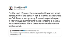 شبکه کلمه/ احمد شهید گزارشگر پیشین ویژه حقوق بشر سازمان در ایران با انتشار توییتی در مورد آزار و اذیت بهاییان در ایران هشدار داد و نوشت: