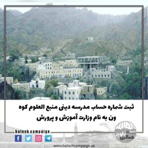شماره حساب بانکی منبع العلوم کوه ون توسط جمهوری اسلامی مصادره و به نام وزارت آموزش و پرورش ثبت شد. به گزارش کمپین فعالین بلوچ، جمهوری اسلامی شماره حساب بانکی مدرسه دینی منبع العلوم کوه ون شهرستان سرباز را مصادره و به نام وزارت آموزش و پرورش ثبت کرد.