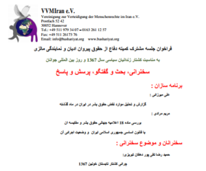 فراخوان جلسه سخنرانی مشترک کمیته دفاع از حقوق پیروان ادیان و نمایندگی مالزی سخنرانی، بحث و گفتگو، پرسش و پاسخ سخنرانان و موضوع سخنرانی : مصطفی خداکرمی : بررسی وضعیت آیت اله سید محمدحسین کاظمینی بروجردی جمشید غلامی سیاوزان : روز جهانی ملل متحد حمید رضا تقی پور دهقان تبریزی : محدودیتهای شهروندی پیروان سایر …