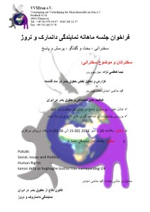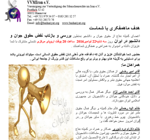 نشست ماهانه اعضای نمایندگی ایالت هسن (گیسن) بررسی اعلامیه جهانی حقوق بشر و نقض آن در ایران: طی ماه گذشته سخنرانی و بحث گفتگو در خصوص مسائل روز برنامه سازان: مهدی موسوی: فعال حقوق بشر: گزارش و تحلیل خبر نقض حقوق بشر در ماه گذشته امیر رضائی: فعال حقوق بشر بررسی و انطباق مواد …
