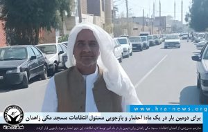خبرگزاری هرانا – خدارحم حسنزهی، از اعضای انتظامات مسجد مکی زاهدان برای دومین بار در ماه اخیر توسط اداره اطلاعات این شهر احضار و مورد بازجویی قرار گرفت.