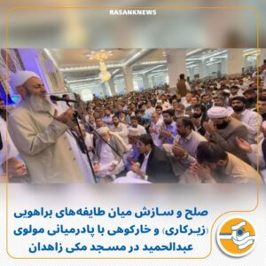 به گزارش رسانک، امروز شنبه ۲۸ تیر ماه ۱۴۰۴، در پی وساطت و تلاشهای مولوی عبدالحمید اسماعیلزهی و با همکاری ریشسفیدان و معتمدان محلی، دو طایفه براهویی (زیرکاری) و خارکوهی پس از هفت سال اختلاف و تنش، در مسجد جامع مکی زاهدان به صلح و سازش رسیدند.