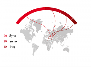 سوریه همچنان در صدر خطرناکترین کشور برای خبرنگاران در جهان قرار دارد. جهادگران گروه دولت اسلامی خبرنگاران را به هدف اصلی خود بدل کردهاند. هدفگیری روزنامهنگاران امری سودمند است، نه تنها برای باجگیری و چرخاندن ماشین جنگ و یا اعمال فشار بر دولتها که برای حاکم کردن جو ارعاب و ترور و به سکوت وادار کردن هر صدای منتقدی درمناطق تحت کنترل خود است. پس از سوریه یمن قرار دارد که بسیجیان شیعه حوثی به ربودن خبرنگاران و یا همکاران رسانهها اقدام میکنند. در عراق ستیزهجویان داعش ۱۰ خبرنگار و همکار رسانهها را موصول از دو سال پیش گروگان گرفتهاند .