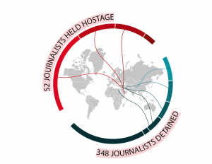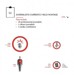 امروز در جهان ۵۲ خبرنگار به گروگان گرفته شدهاند. قربانیان همه مرد در مناطق جنگزده و در خاورمیانه به دام افتادهاند.۸۹ درصد آنها خبرنگاران محلی هستند. گروگانگیری خبرنگاران در سال جاری رشدی ۳۵ درصدی داشته است. دو کشور عراق و سوریه خطرناکترین کشورها برای خبرنگاران در جهان هستند. گروه دولت اسلامی به تنهای ۳۶ تن از این گروگانها را در اختیار دارد .