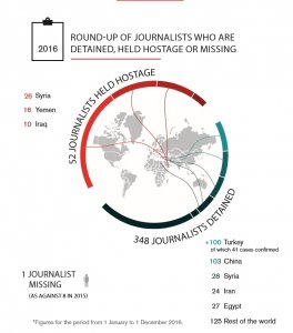 یلان روزنامهنگاران زندانی، ناپدید شده و گروگان در جهان ۲۰۱۶