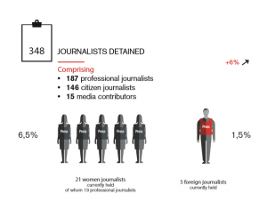 امروز ۳۴۸ روزنامهنگار در سراسر جهان زندانی هستند. این شمار زندانی نسبت به سال گذشته افزایشی۶درصدی را نشان میدهد. شاخصها نشان از رشد نگران کننده زندانی کردن روزنامهنگاران در جهان دارد. درصد روزنامهنگاران حرفهای در زندان افزایشی ۲۲ درصدی داشته است، سرکوب روزنامهنگاران در جهان با ضرباهنگی جهنمی افزایش مییابد. در دروازه اروپا، پیش برد سیاست رعب و وحشت در ترکیه دهها روزنامهنگار را به زندان کشانده و این کشور را به بزرگترین زندان جهان برای روزنامه نگاران تبدیل کرده است. در کمتر از یک سال رژیم اردوغان کثرتگرایی رسانهای در ترکیه را با نظارت ساکت اتحادیه اروپا نابود کرده است .