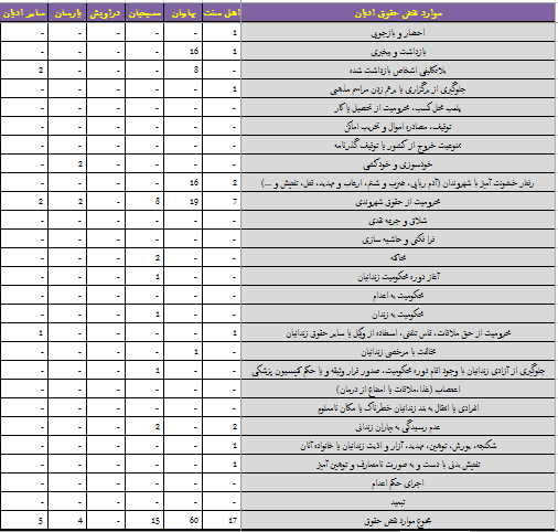 | محرومیت از حق ملاقات، تماس تلفنی، استفاده از وکیل یا سایر حقوق زندانیان | ۱ مورد | |