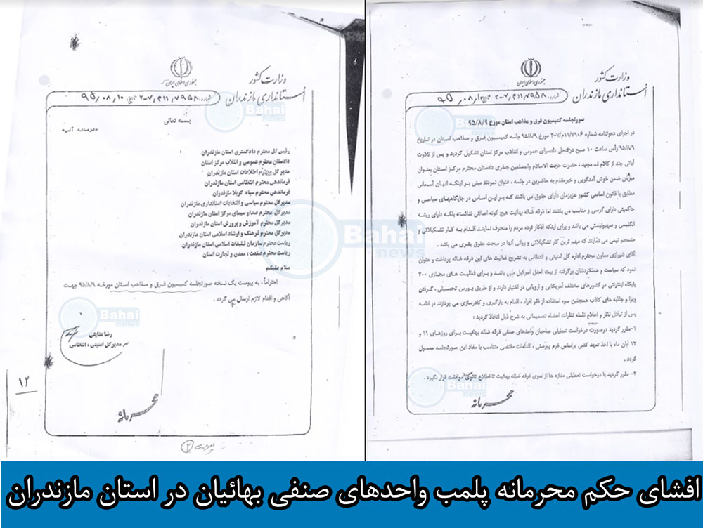 حکم محرمانه پلمب محل کسب بهائیان از سوی استانداری مازندران که در صورتجلسه کمیسیون فرق و مذاهب استان مازندران پس از گذشت شش ماه از پلمب ۹۴ محل کسب بهائیان صادر شده بود، در اختیار خبرگزاری بهایی نیوز قرار گرفت.