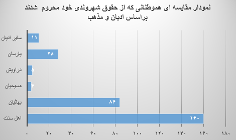 ماده ۲۰ قانون اساسی جمهوری اسلامی ایران برابری تمام شهروندان ایرانی را بر اساس موازین اسلام مورد تأکید قرار میدهد. بااینحال در کنار سایر پیروان ادیان در ایران که این ماده اساسی نتوانسته برابری آنان را در بیش از سه دهه گذشته در برخورداری از حقوق شهروندی تضمین کند، پیروان اهل سنت در ایران نیز علیرغم اینکه مسلمان هستند شرایط مشابهی دارند، آنان نیز از تصاحب مسئولیتهای کلان مدیریتی کشوری و لشگری و نیز بهرهمندی برابر از فرصتها و امکانات محروم هستند، همینطور با موانع و محدودیتهای جدی برای تبلیغ باورهای خود و بهجا آوردن مناسک مذهبی خود از سوی حکومت ایران روبهرو هستند.