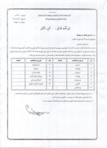 اداره دولتی آموزش و پرورش استان مازندران با موضوع «ارسال آمار فرق و مذاهب»بخشنامه ی را ارسال کرده است که نشان از وجود تفتیش عقاید در این استان دارد.