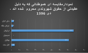 روند ستیز با بهاییان در این ماه نیز ادامه داشت بهگونهای که حقوق شهروندان بهایی در موارد ذیل نقض گردید.
