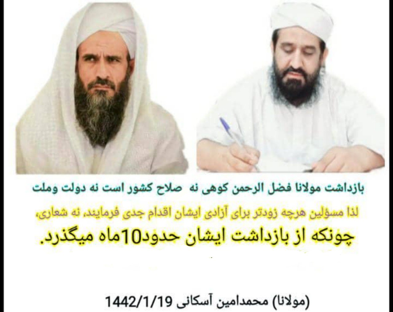 مولوی محمد امین آسکانی نیز گفته است: ”تداوم بازداشت و بلاتکلیفی مولوی فضل الرحمن کوهی به صلاح کشور، دولت و ملت نیست و مسئولین هر چه سریع تر زمینه آزادی وی را بدون سر دادن شعار فراهم کنند.“