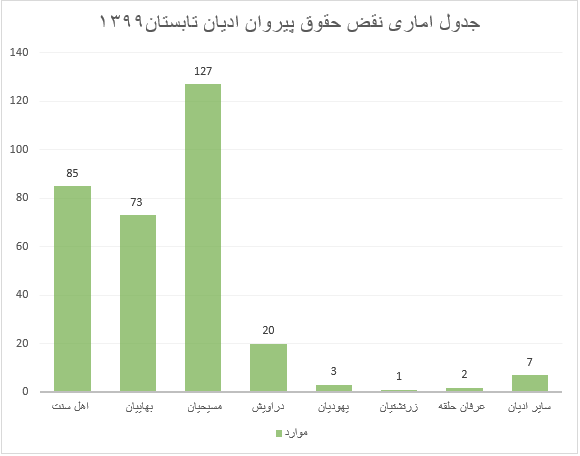 آمار فوق از گزارشات رسانه های داخلی و خارجی مورد تائید دولت جمهوری اسلامی ایران جمع آوری شده و عملا نمی تواند بیش از ۳۰ در صد واقعیت های جامعه باشد. این گزارشات از سایت کمیته دفاع از حقوق پیروان ادیان که از رسانه های داخلی و خارجی مانند ایسنا؛ هرانا ؛ ایرنا ؛ایلنا، هنر آنلاین؛ باشگاه خبرنگاران جوان؛ خبرگزاری فارس، کیهان، همشهری آنلاین، مهرنیوز جمع آوری گردیده است. اعضائیکه درگردآوری اخبار نقض حقوق پیروان ادیان تابستان 1399 همکاری نموده اند عبارتند از: سید شایان حسینی برزی ، رضا عباسی زمان آبادی ،سام جباری کرمانی ، عباس رضایی سالاروند .