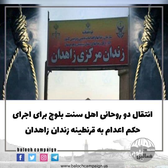 به گزارش کمپین فعالین بلوچ، مولوی امان الله بلوچی و حافظ عبدالرحیم کوهی دو روحانی اهل سنت محبوس در زندان مرکزی زاهدان برای اجرای حکم اعدام امروز دوشنبه ۲۷ دی ماه به قرنطینه زندان منتقل شده اند.