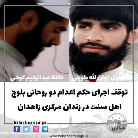 به گزارش کمپین فعالین بلوچ، دو تن از روحانیون بلوچ اهل سنت به نام های مولوی “امان الله بلوچی” و حافظ “عبدالرحیم کوهی” که روز دوشنبه ۲۷ دی ماه برای اجرای حکم اعدام به قرنطینه منتقل شده بودند، روز گذشته ۳۰ دی ماه با توقف اجرای حکم به بند عمومی بازگردانده شدند.