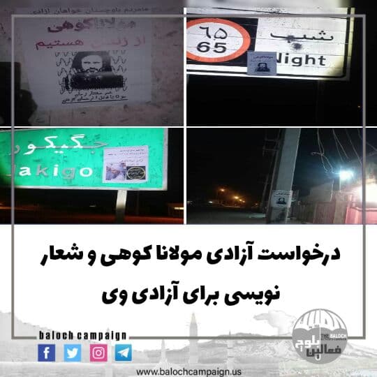 جمعی از جوانان جکیگور برای آزادی مولانا کوهی اقدام به شعارنویسی و نصب پلاکارد کردند.