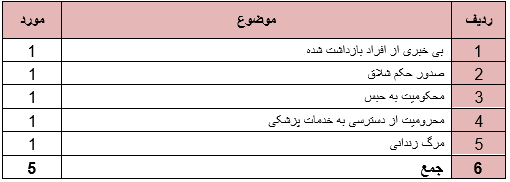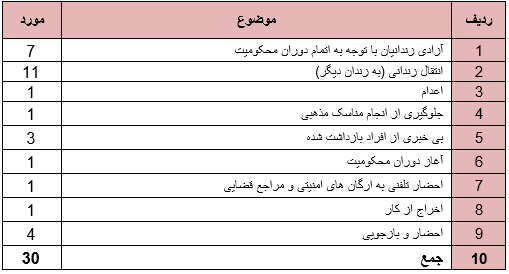 روند ستیز با دراویش در این ماه نیز ادامه داشت به گونه ای که حقوق دراویش در موارد ذیل نقض گردید.