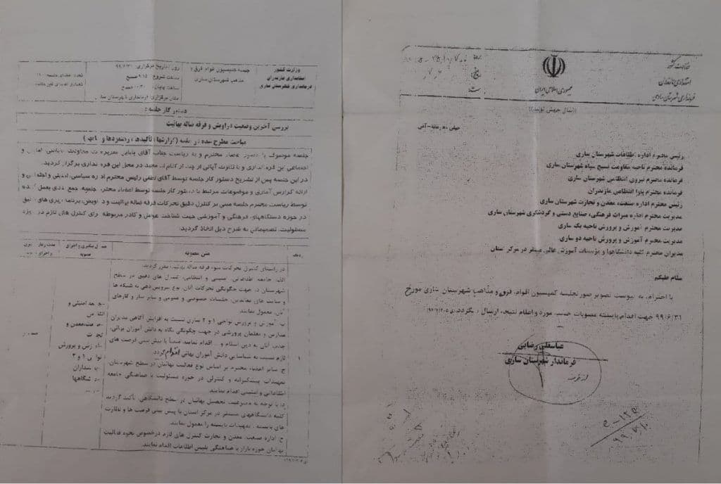 در تاریخ ۳۱ شهریور، جلسهای با حضور نمایندگان تعدادی از سازمان امنیتی و دولتی ایران، در شهر ساری برگزار شد. با توجه به اسناد محرمانه منتشر شده، علاوه بر افزایش کنترل فعالیت شهروندان بهائی، به مدیران ادارات آموزش و پرورش وظیفه شناسایی دانش آموزان بهائی و جذب آنان به اسلام داده شده و از روسای دانشگاه نیز خواسته شده که با توجه به ممنوعیت تحصیل بهائیان در دانشگاه ها به این موضوع نظارت کنند.