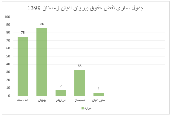 آمار فوق از گزارشات رسانه های داخلی و خارجی مورد تائید دولت جمهوری اسلامی ایران جمع آوری شده و عملا نمی تواند بیش از ۳۰ در صد واقعیت های جامعه باشد. این گزارشات از سایت کمیته دفاع از حقوق پیروان ادیان که از رسانه های داخلی و خارجی مانند ایسنا؛ هرانا ؛ ایرنا ؛ایلنا، هنر آنلاین؛ باشگاه خبرنگاران جوان؛ خبرگزاری فارس، کیهان، همشهری آنلاین، مهرنیوز جمع آوری گردیده است. اعضائیکه درگردآوری اخبار نقض حقوق پیروان ادیان در زمستان 1399همکاری نموده اند عبارتند از: سید شایان حسینی برزی ، سام جباری کرمانی ، رضا عباسی زمان آبادی ، عباس رضایی سالاروند .