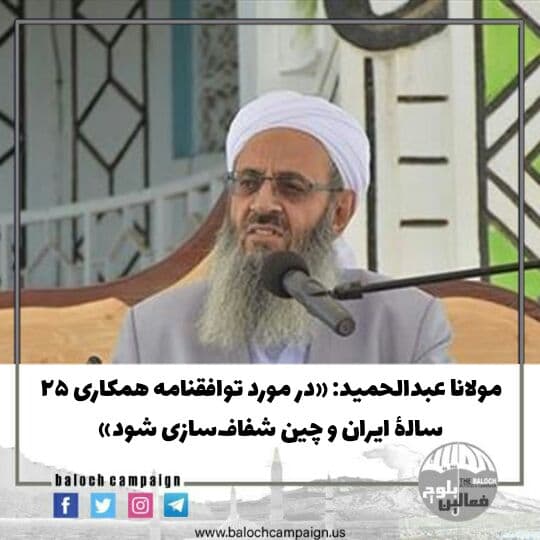 به گزارش کمپین فعالین بلوچ، مولانا عبدالحمید، روز جمعه ۱۳ فروردین ۱۴۰۰ در مراسم نماز جمعه زاهدان با اشاره به امضای توافقنامۀ همکاری ۲۵ ساله بین ایران و چین، با بیان اینکه مردم و رسانهها در مورد این توافقنامه «دغدغه و نگرانی» دارند، گفته که در خصوص توافقنامۀ مذکور «شفافسازی» شود و محتوای آن در اختیار رسانهها قرار گیرد.