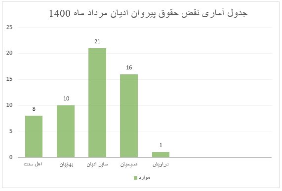آمار فوق از گزارشات رسانه های داخلی و خارجی مورد تائید دولت جمهوری اسلامی ایران جمع آوری شده و عملا نمی تواند بیش از ۲۵ تا ۳۰ در صد واقعیت های جامعه باشد. این گزارشات آماری از میان بیش از38 خبر که در طول ماه مرداد 1400 تهیه شده است. این گزارشات از سایت کمیته دفاع از حقوق پیروان حقوق ادیان که از رسانه های داخلی و خارجی مانند ایسنا؛ هرانا ؛ ایسنا، هرانا، ایرنا ؛ایلنا، هنر آنلاین؛ باشگاه خبرنگاران جوان؛ خبرگزاری فارس، کیهان، همشهری آنلاین، مهرنیوز، سازمان ماده 18 ، کردپرس ، کردپا ، کمپین فعالین بلوچ ، هه نگاو ، بی بی سی فارسی ، جمع آوری گردیده، تهیه شده است. همکارانی که درگردآوری این موارد خبری نقض حقوق ادیان دراردیبهشت ماه همکاری کردند خانمها و آقایان: سید شایان حسینی برزی، سام جباری کرمانی،عباس رضایی سالاروند، مریم افتخار،آذر ارحمی،رضا عباسی زمان آبادی،شراره هادی زاده رئیسی ، هادی درتومی،محمود غفوریان پیرنیا، هستی عبدالهی اصل،تی تی خطی ،کریم ناصری،سمانه بیرجندی،سارا اسدی ،مهدی افشار زاده، رسول عباسی زمان آبادی می باشند. اطلاعات بیشتر در لینک زیر قابل مشاهده است: