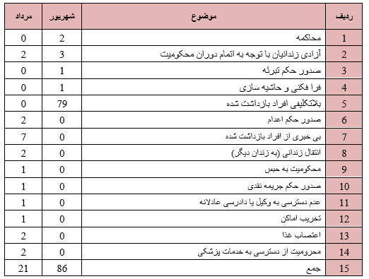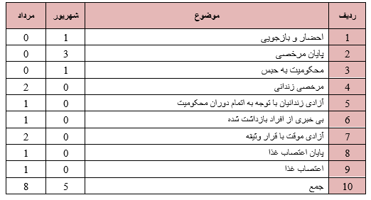 روند ستیز با دراویش گنابادی در این ماه نیز ادامه داشت به گونه ای که حقوق دراویش در موارد ذیل نقض گردید: