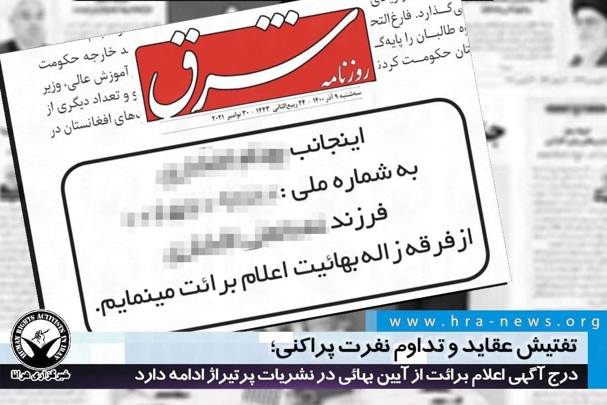 در روزهای اخیر آگهی در روزنامه شرق منتشر شده است که حاوی اظهار اعلام برائت یک شهروند از آیین بهائی است.