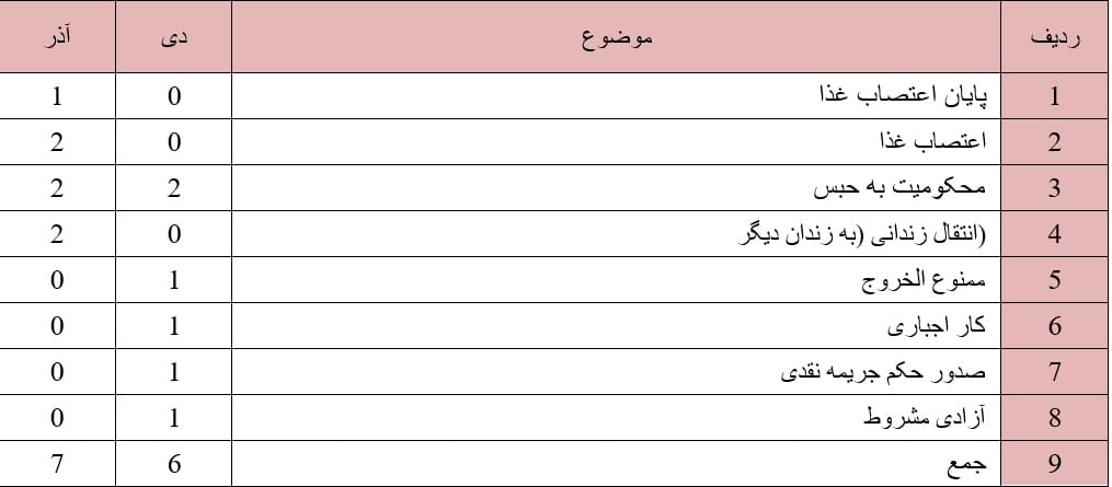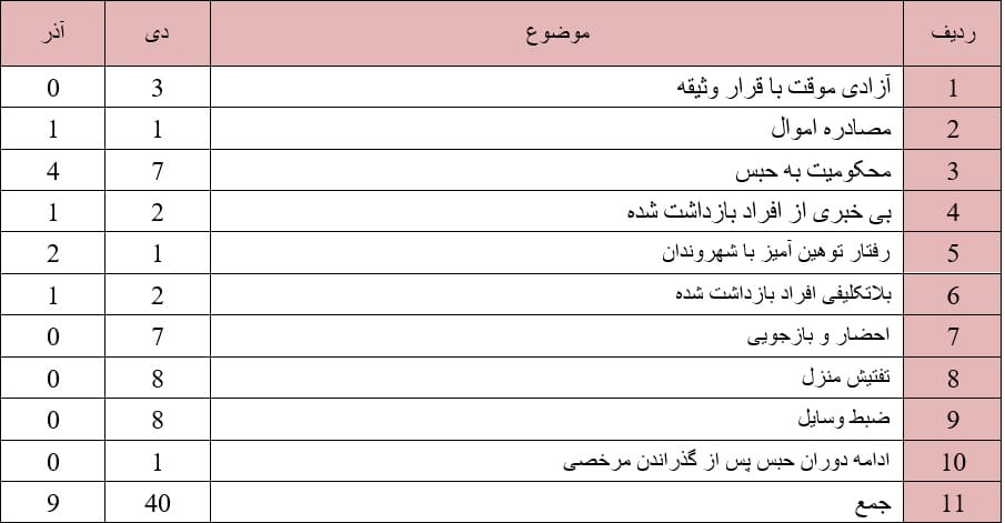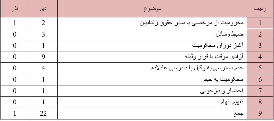 روند ستیز با دراویش گنابادی در این ماه نیز ادامه داشت به گونه ای که حقوق دراویش در موارد ذیل نقض گردید: