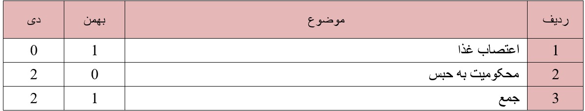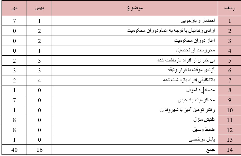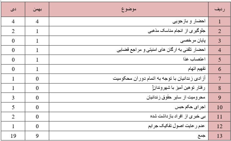 در این ماه :روند ستیز با دراویش گنابادی در این ماه نیز ادامه داشت به گونه ای که حقوق دراویش در موارد ذیل نقض گردید: