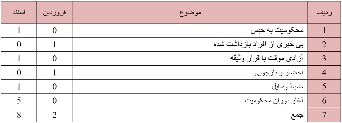 روند ستیز با دراویش گنابادی در این ماه نیز ادامه داشت به گونه ای که حقوق دراویش در موارد ذیل نقض گردید: