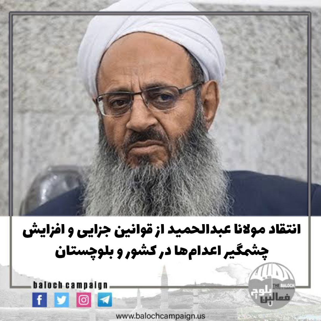 به گزارش کمپین فعالین بلوچ، روز گذشته ۲۰ خرداد ۱۴۰۱، مولانا عبدالحمید، در مراسم نماز جمعه با انتقاد از افزایش اعدامها در کشور و استان سیستان و بلوچستان، خواستار تجدید نظر مسئولان در قوانین جزایی شد.