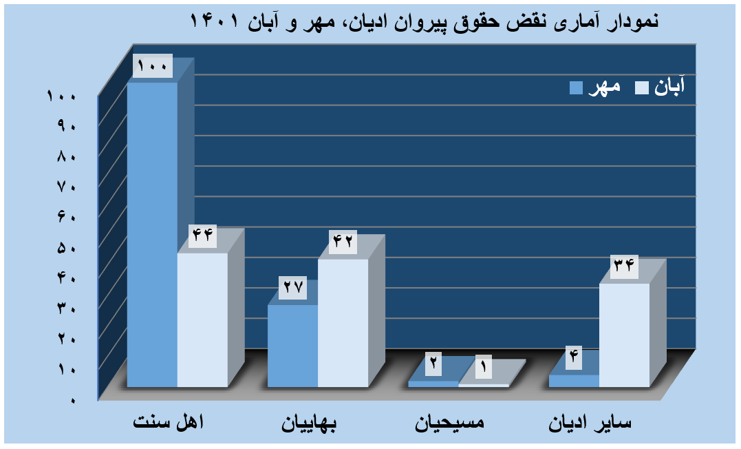 آمار فوق از گزارشات رسانه های داخلی و خارجی مورد تائید دولت جمهوری اسلامی ایران جمع آوری شده و عملا نمی تواند بیش از ۲۵ تا ۳۰ در صد واقعیت های جامعه باشد. این گزارشات آماری از میان بیش از 62 خبر که در طول آبان ماه 1401 تهیه شده است. این گزارشات از سایت کمیته دفاع از حقوق پیروان حقوق ادیان که از رسانه های داخلی و خارجی مانند ایسنا ، هرانا ، ایسنا ، ایرنا ، ایلنا ، هنر آنلاین ، باشگاه خبرنگاران جوان ، خبرگزاری فارس ، کیهان ، همشهری آنلاین ، آباننیوز، سازمان ماده 18 ، کردپرس ، کردپا ، کمپین فعالین بلوچ ، هه نگاو ، بی بی سی فارسی ، جمع آوری گردیده، تهیه شده است. همکارانی که درگردآوری این موارد خبری نقض حقوق ادیان درآبان ماه همکاری کردند خانمها و آقایان: کریم ناصری، علی فروتن، سعید پورمند، وحید چرخ انداز یگانه، صدرا مجیب یزدانی، سمانه بیرجندی، مریم افتخار، امین بلوردی بهمن، اسفندیار سنگری، داود لطفی، امین ظهیری، محمد مهدی خسرو پناه، ندا غفاری گوندوغدویی، شهناز کریم زاده مقدم، رضا عباسی زمان آبادی، حسین اریس ، عباس رهبری، مریم حبیبی، لیلا ابوطالبی، کوثر ولی زاده، شراره هادیزاده رئیسی، مهرداد یگانه، مهرنوش ایمانی چگنی می باشند. اطلاعات بیشتر در لینک زیر قابل مشاهده است: