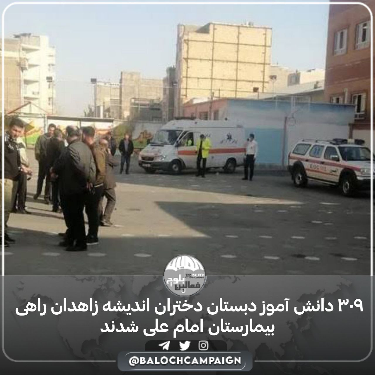 کمپین فعالین بلوچ: روز گذشته ۱۵ اسفند ماه ۱۴۰۱، دستکم ۳۰۹ دانش آموز دبستان دخترانه اندیشه زاهدان به دلیل انتشار گازهای سمی راهی بیمارستان امام علی شدند.