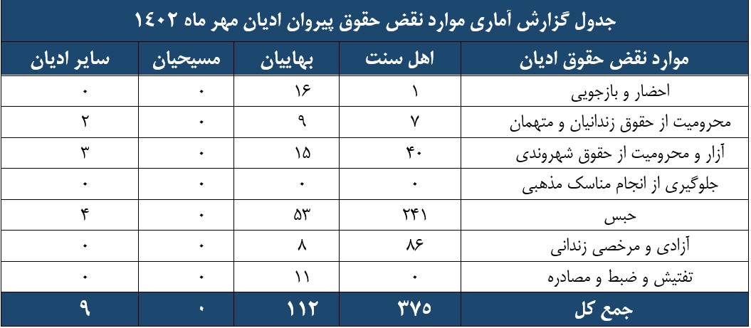 گزارش ماهیانه نقض حقوق پیروان ادیان مهرماه 1402
