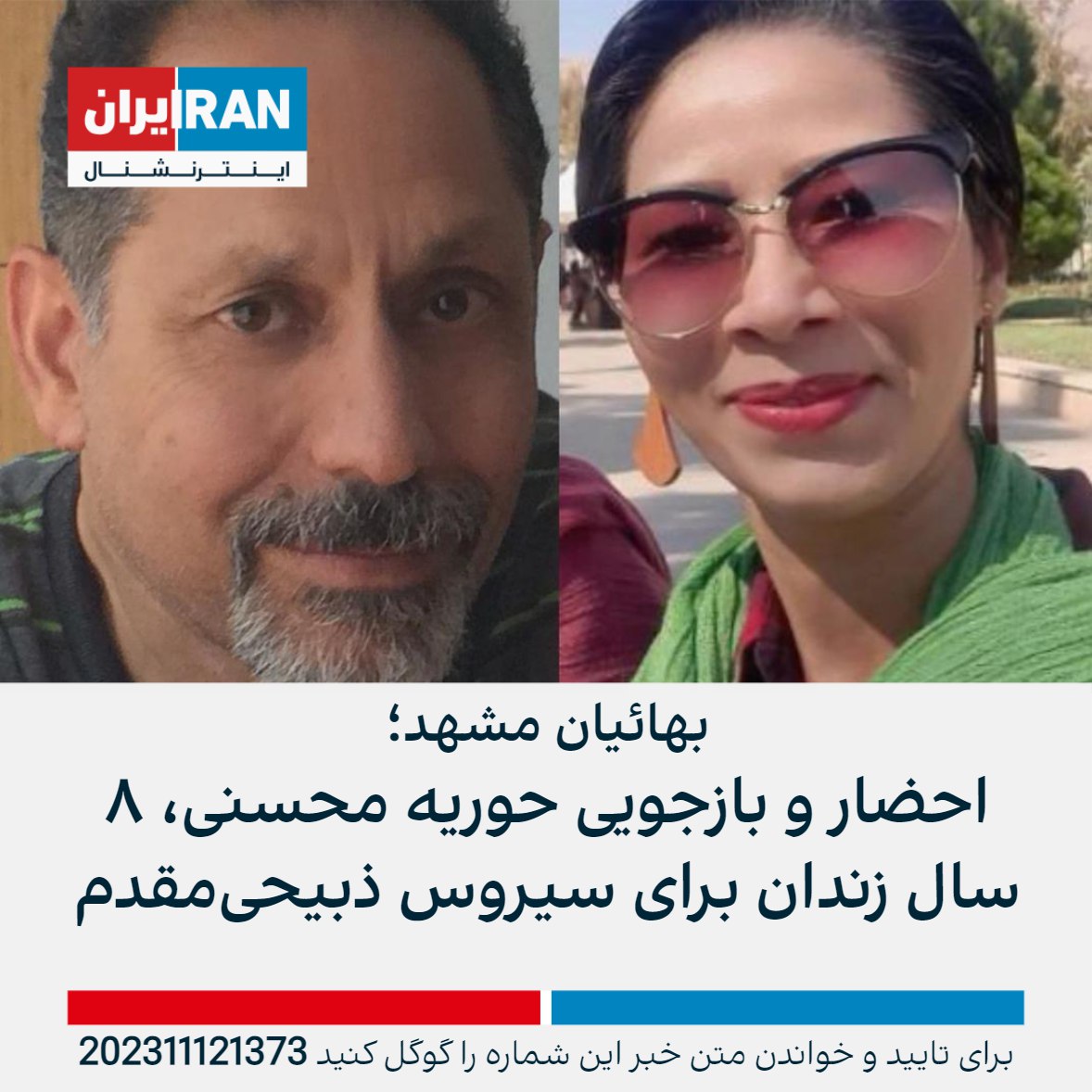 بر اساس اطلاعات رسیده به ایران اینترنشنال، حوریه محسنی، شهروند بهائی ساکن مشهد پس از احضار به دادسرای انقلاب این شهر و تفهیم اتهام با تودیع قرار وثیقه آزاد شد. سیروس ذبیحیمقدم، شهروند بهائی دیگر هم با حکم دادگاه انقلاب مشهد به ۸ سال زندان محکوم شد.