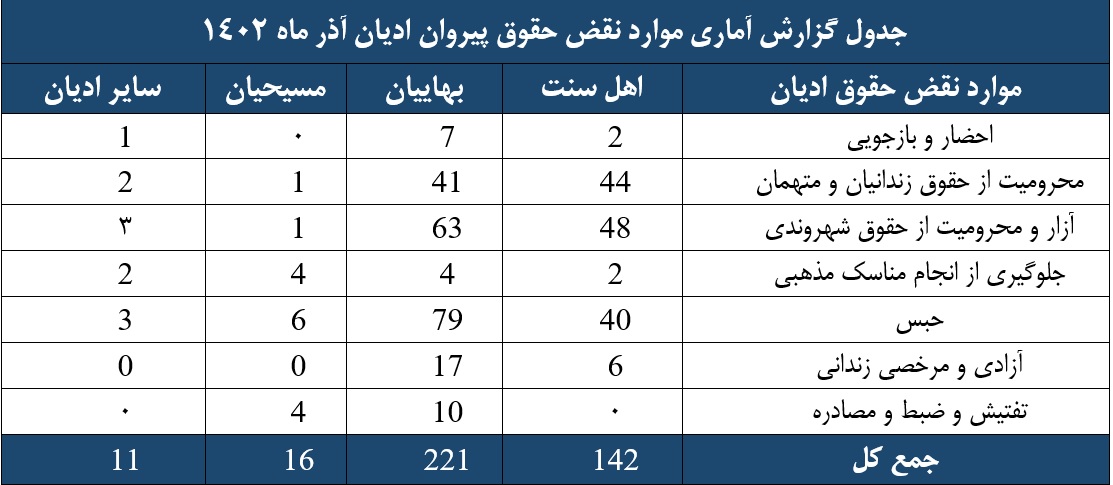 گزارش ماهیانه نقض حقوق پیروان ادیان آذرماه 1402