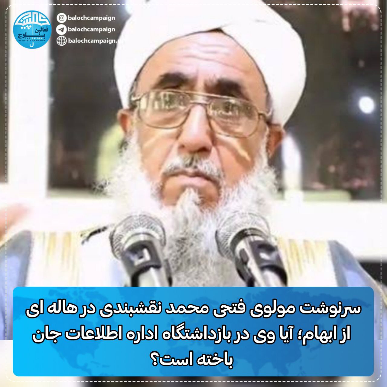 به گزارش کمپین فعالین بلوچ، بیخبری از سرنوشت مولوی فتحی محمد نقشبندی و محرومیت از تماس وی با خانواده، گمانه زنی ها مبنی بر جان باختن وی در بازداشتگاه اداره اطلاعات زاهدان در زیر شکنجه را افزایش داده است.