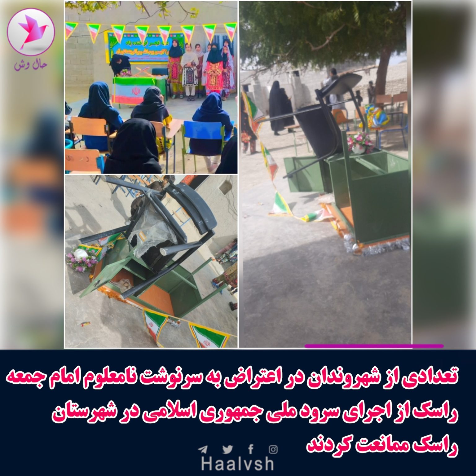 به گفته منابع حال وش: «روز گذشته شهروندان روستای حسنآباد شهرستان راسک از اجرای سرود ملی جمهوری اسلامی با پخش در بلنگو و اجرای مراسم دهه فجر ممانعت کرده و اجازه خواندن سرود به دانش آموزان نداده و میز و صندلی های مراسم که در حیاط مدرسه چیده شده بودند را بهم زدهاند.»