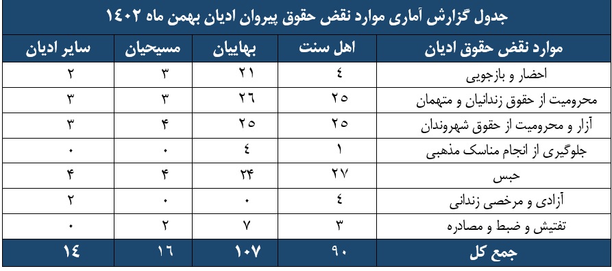 گزارش ماهیانه نقض حقوق پیروان ادیان بهمن ماه 1402