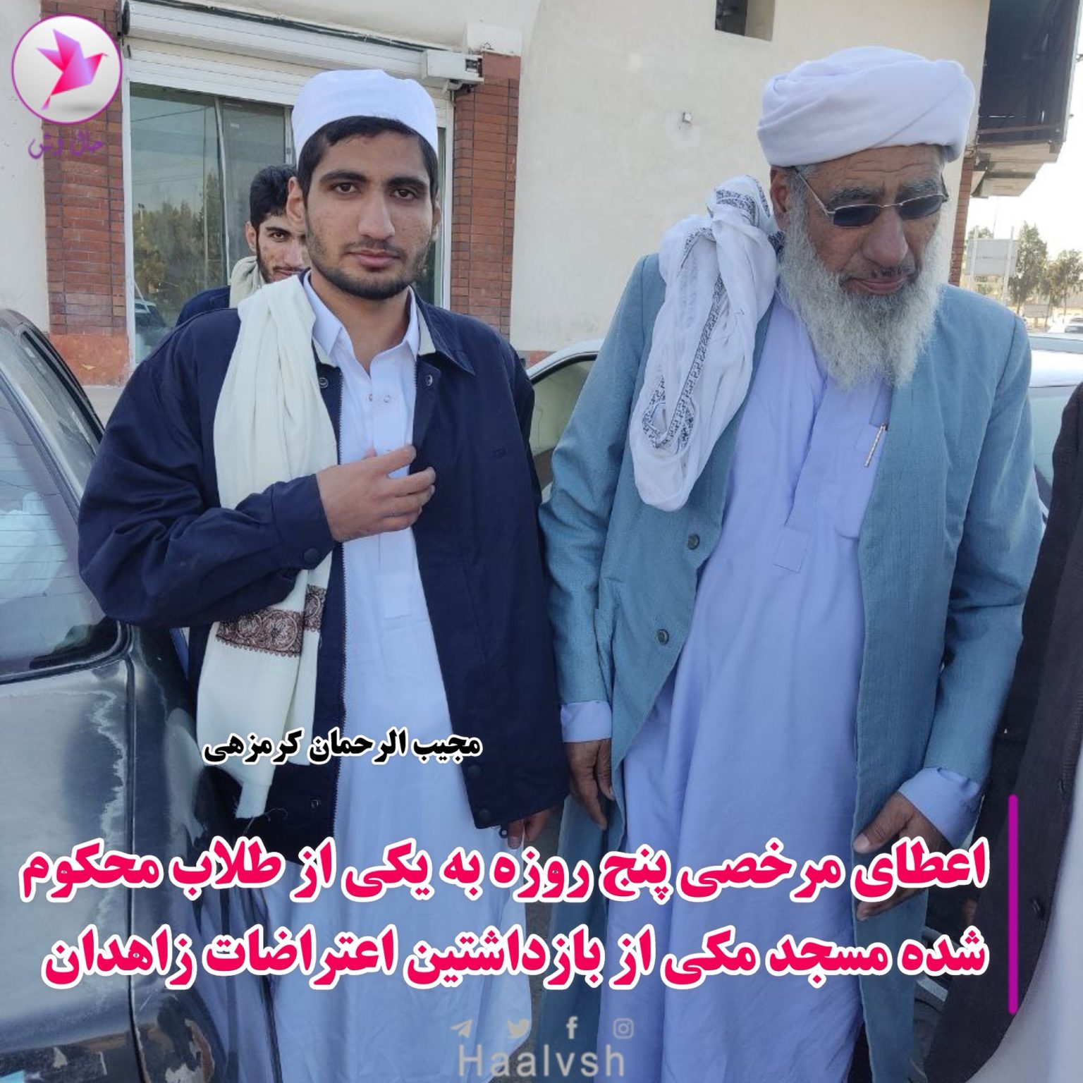 به گزارش حال وش/ امروز یکشنبه ۱۳ اسفند ماه ۱۴۰۲، «مجیب الرحمان کرمزهی» یکی از طلاب مسجد مکی زاهدان که در ۲۸ مهرماه ۱۴۰۲، توسط نیروهای امنیتی در سطح شهر زاهدان با خشونت بازداشت شده بود و به دو سال حبس تعزیزی محکوم شده بوده با قید وثیقه به مرخصی پنج روزه از زندان مرکزی زاهدان اعزام شد.