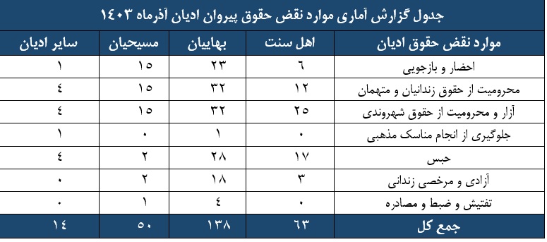 گزارش آماری نقض حقوق پیروان ادیان، آذرماه 1403