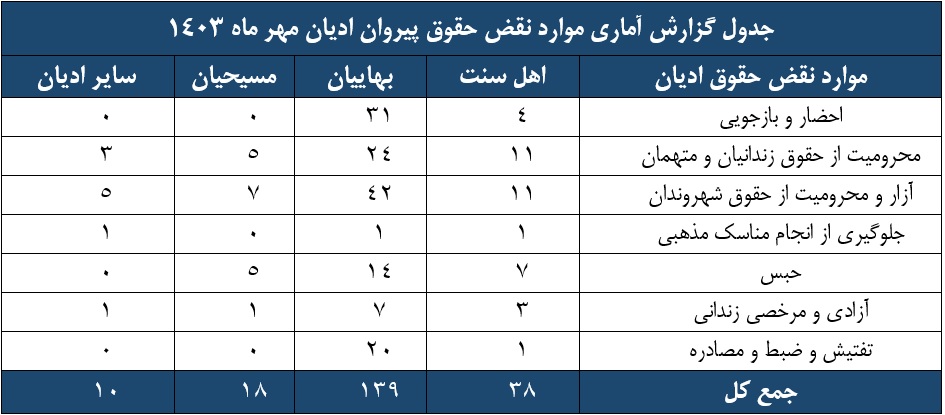 گزارش آماری نقض حقوق پیروان ادیان، مهرماه 1403